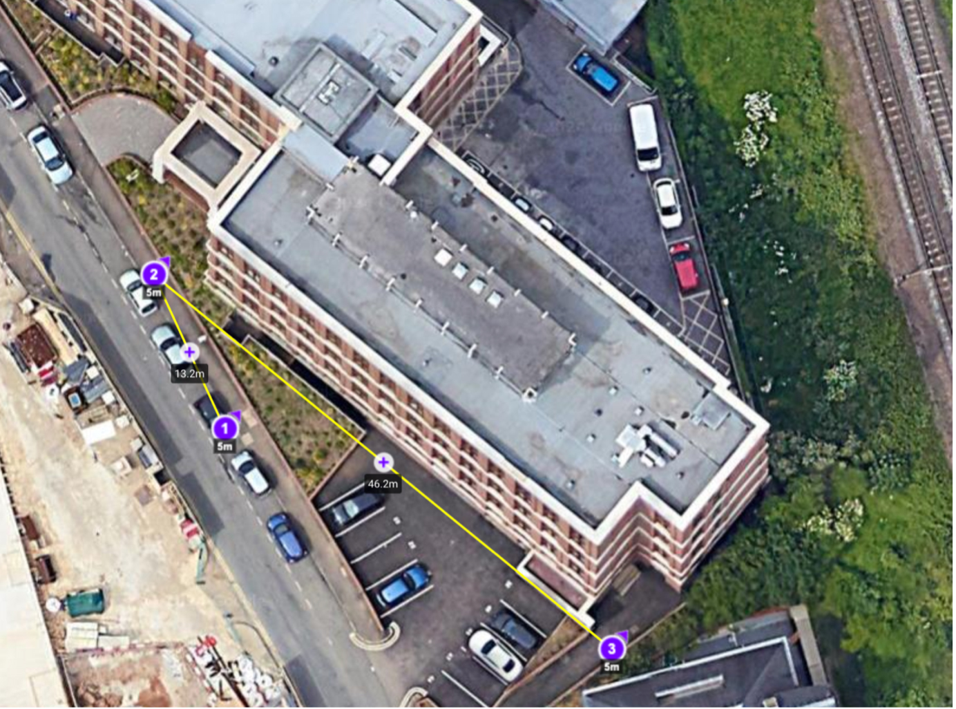 On the map, place your initial setup waypoint close to the façade mapping mission's start point. This is where the drone will ascend to the beginning altitude and orient appropriately. Then, set the second waypoint at one end of the mission's horizontal plane and the third waypoint at the opposite end.